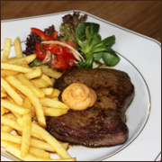 Rumpsteak medium mit Kräuterbutter, Pommes & Salat | ||